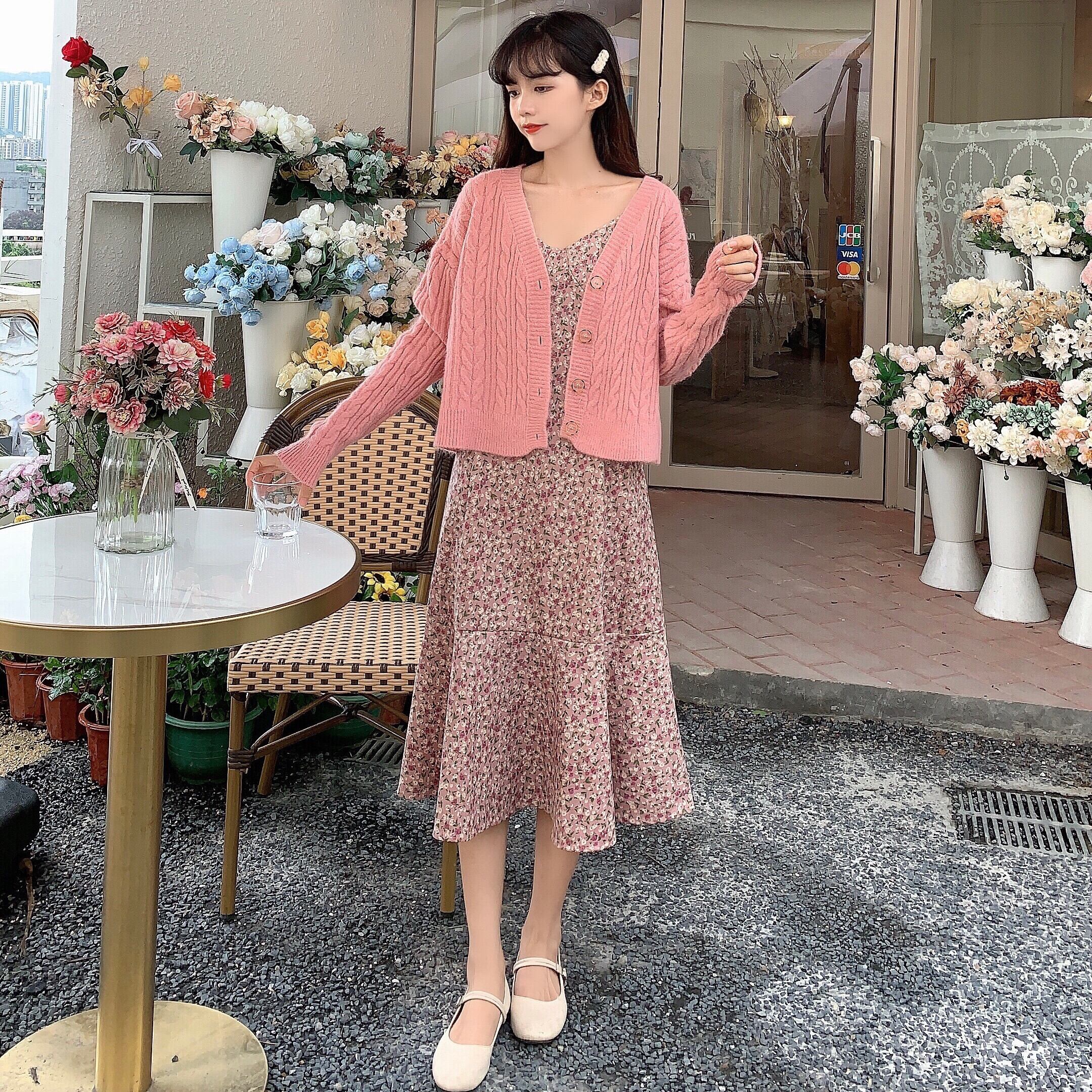 色:オフホワイトセーターシングル,ピンクのセーターシングル,コーヒーカラーAラインサスペンダースカートワンピース,ピンクフィッシュテールスリングスカートワンピース