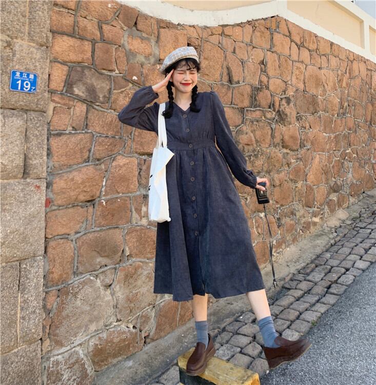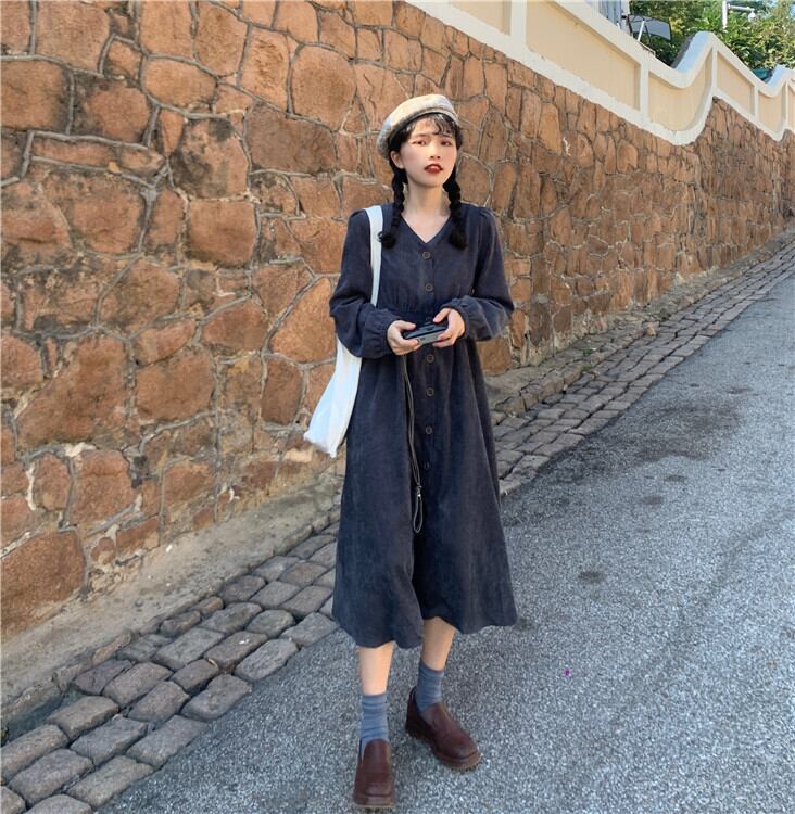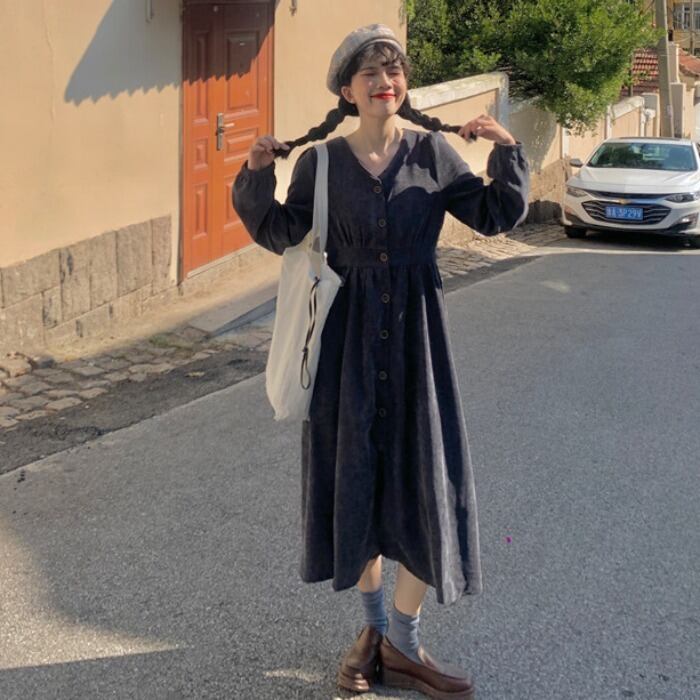 スタンダードハイウエストウエストルーズ薄手ソリッド カラーロング マキシ ロング丈 マキシ丈コーデュロイ長袖 長そでスリーブ 袖ドレス ワンピース ハイウェスト マキシロング丈 レトロ ソリッドカラー 女性 レディース ゆめかわ99923349199 | nice import1