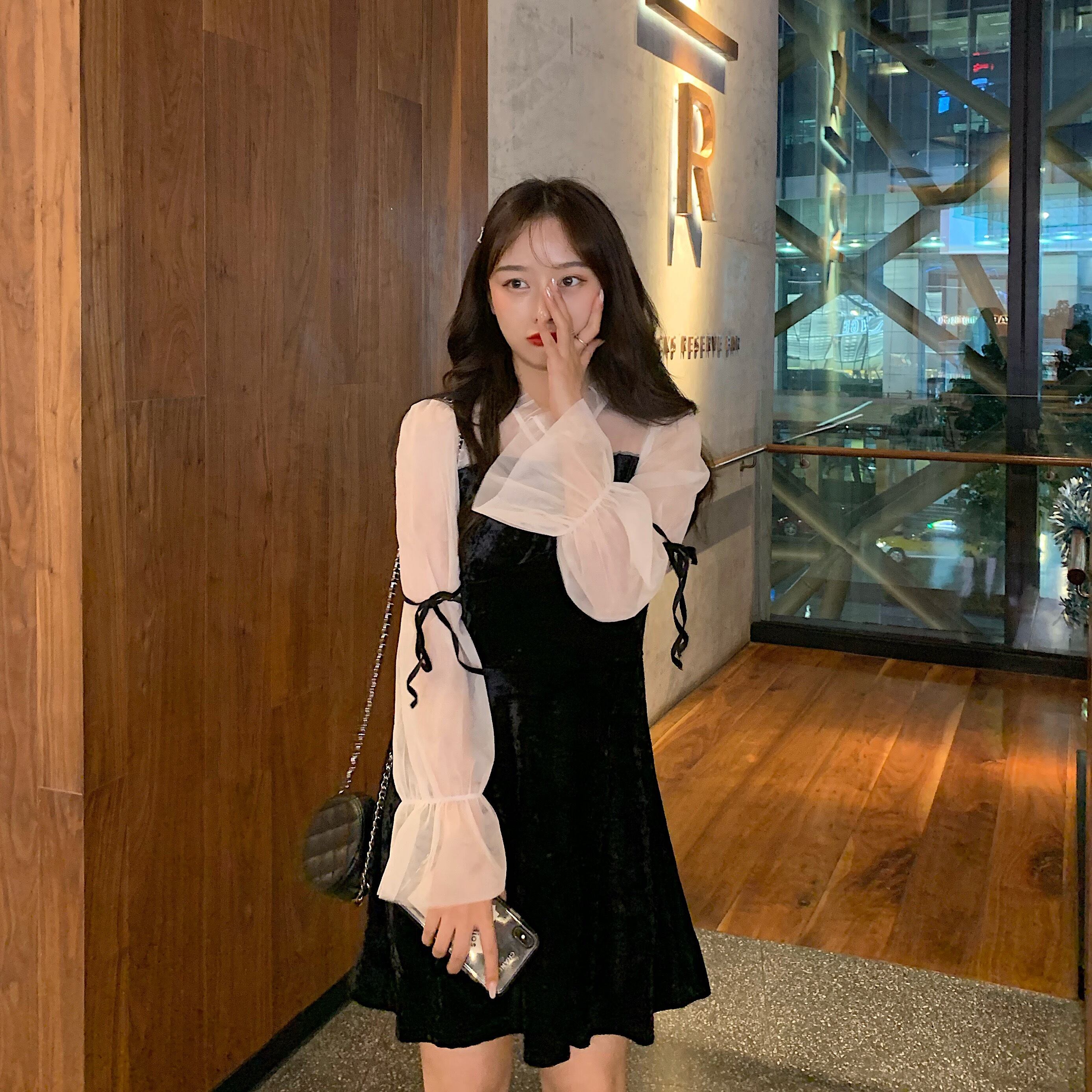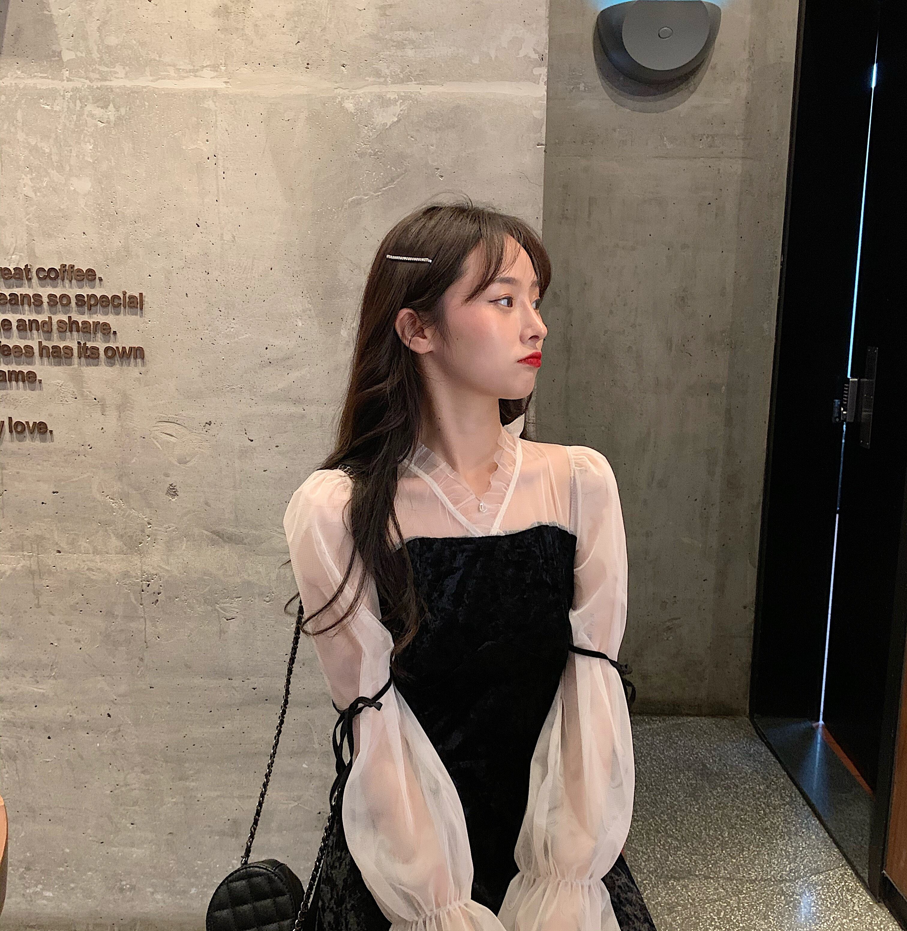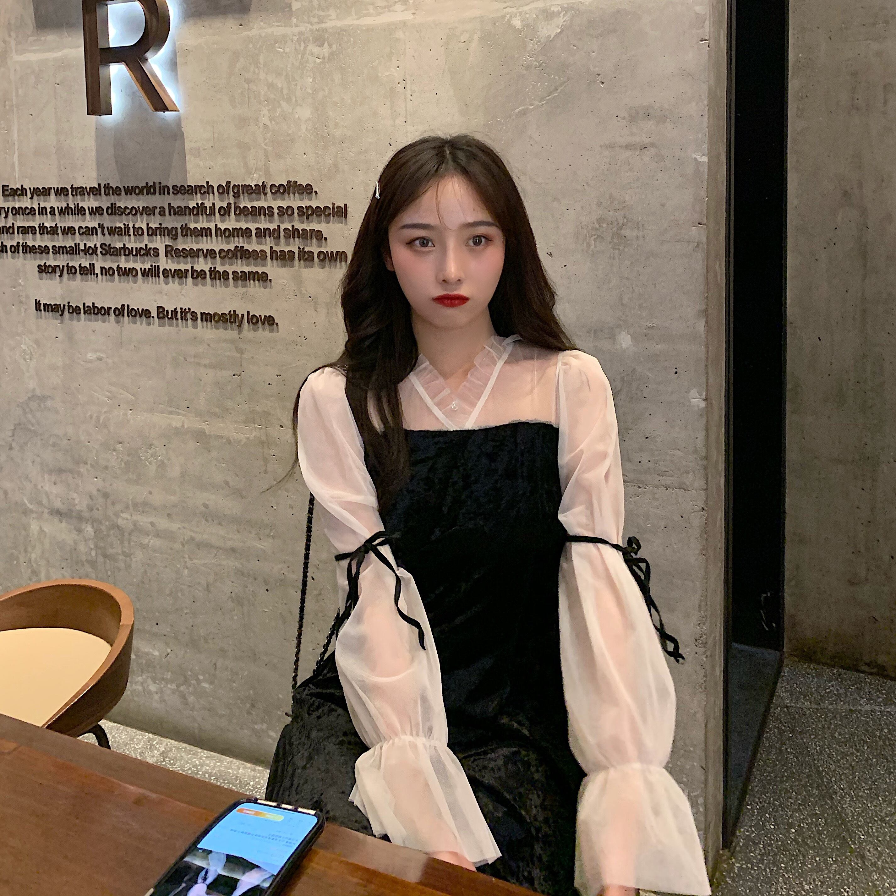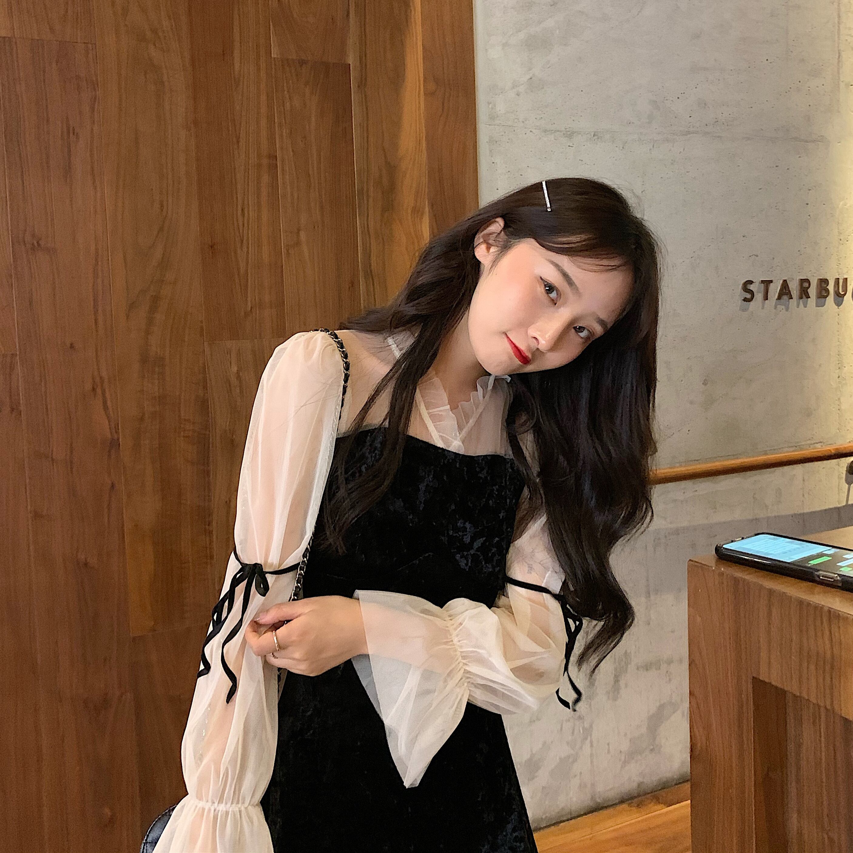 スタンダードベルベットブラック 黒ドレス ワンピースメッシュ レース シースルー チュール オーガンジースリーブ 袖薄手 レトロ ステッチ 女性 レディース ゆめかわ20858649022 | nice import1