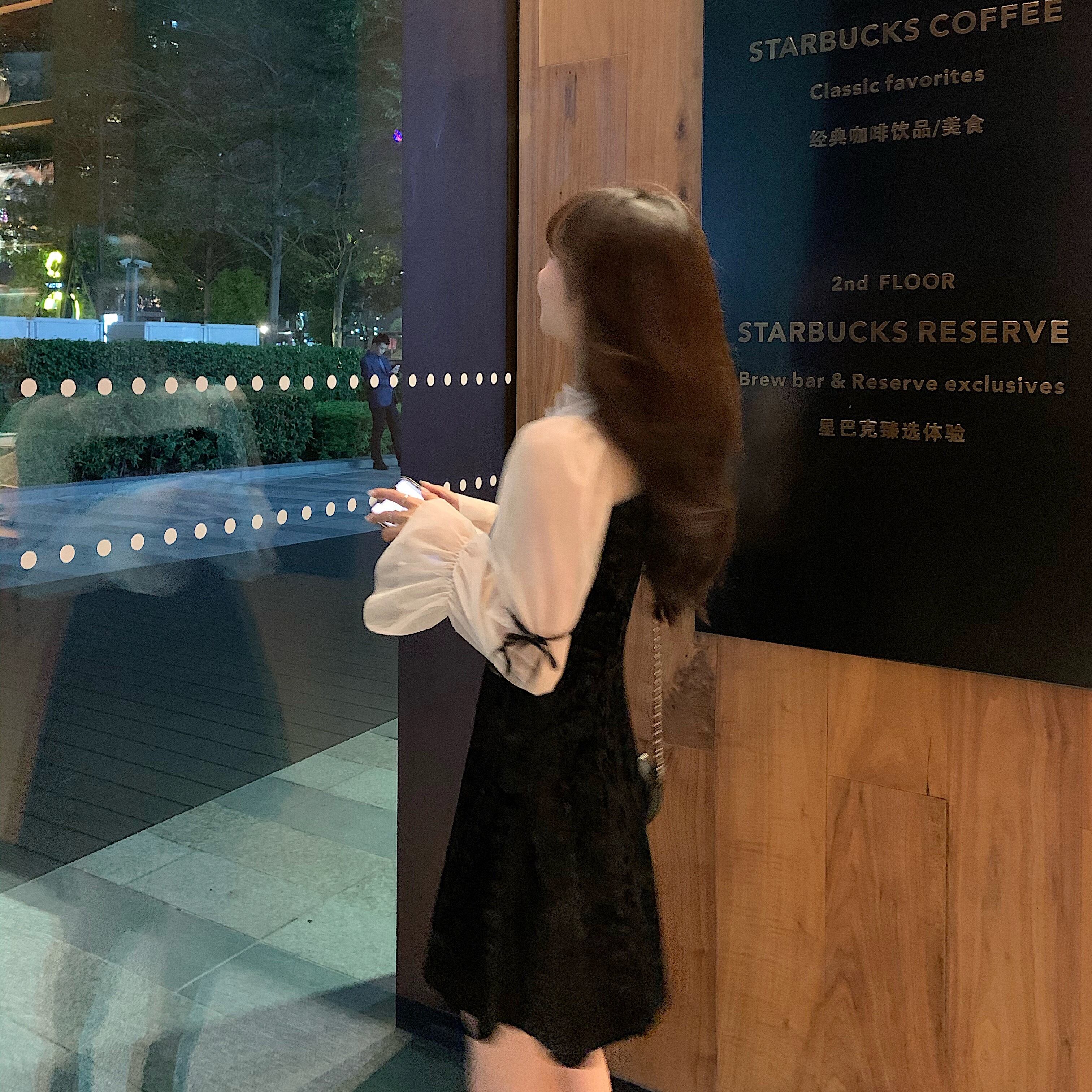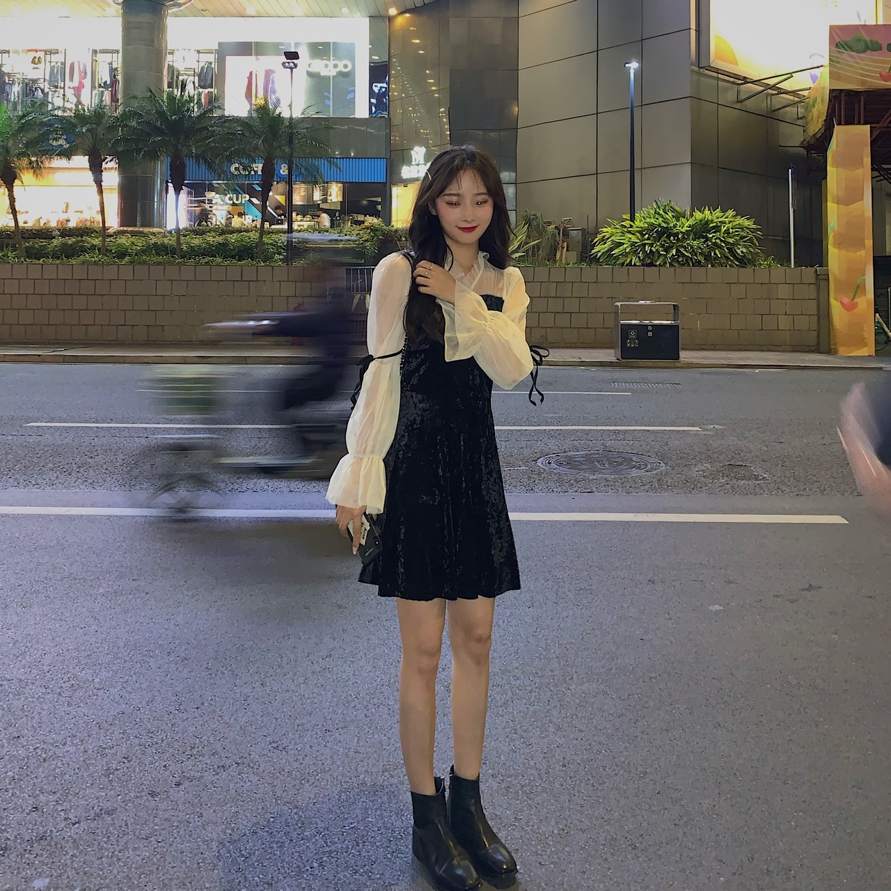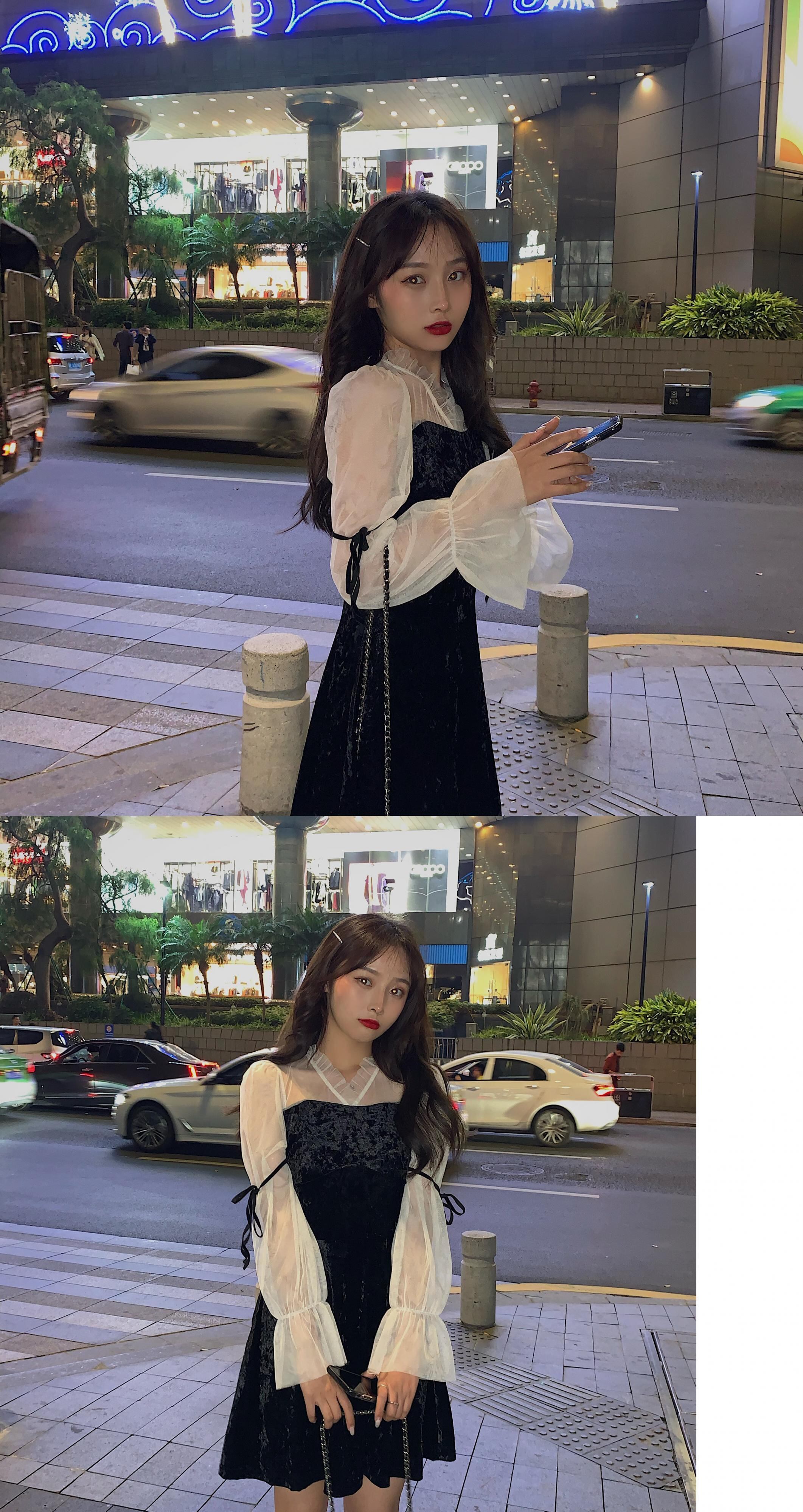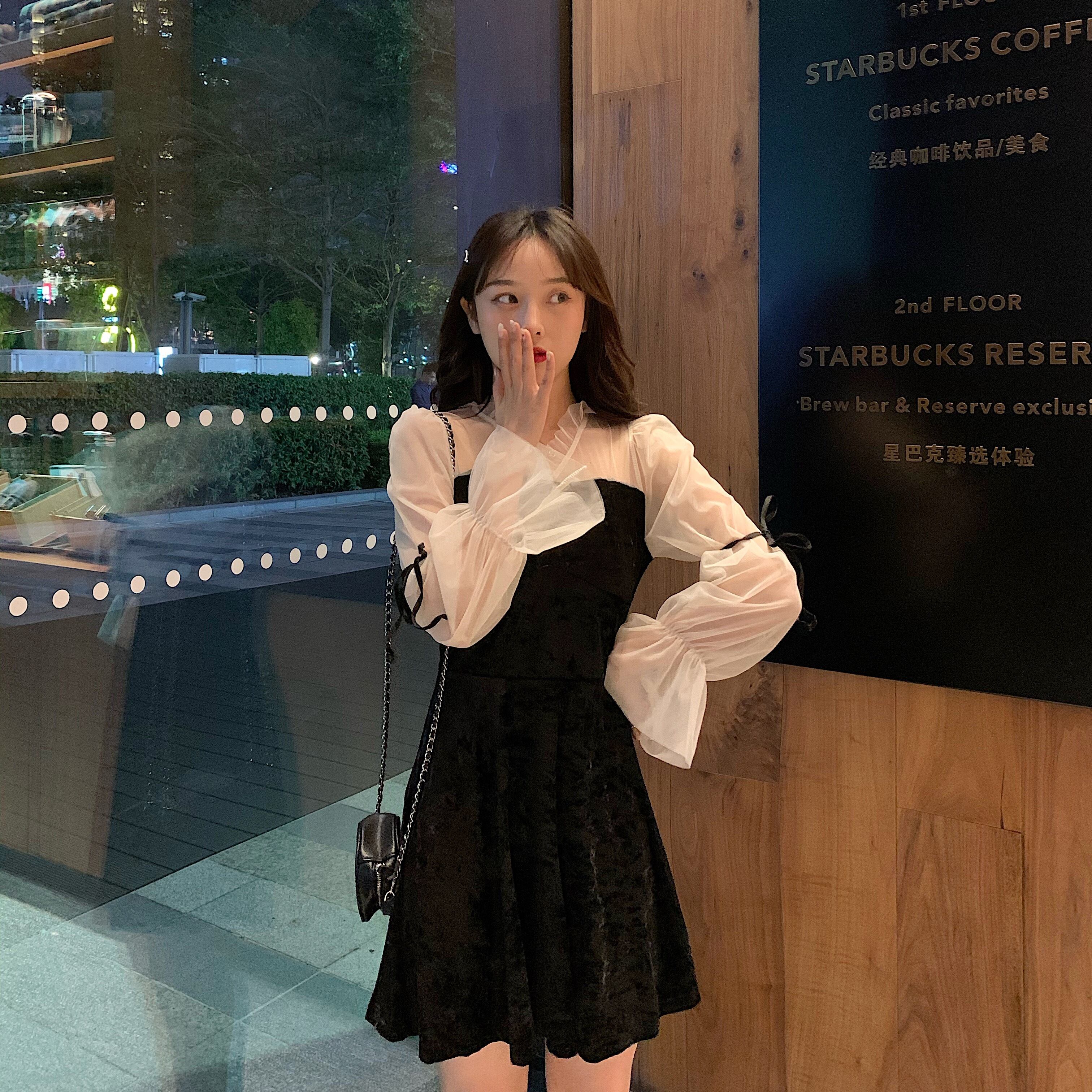 スタンダードベルベットブラック 黒ドレス ワンピースメッシュ レース シースルー チュール オーガンジースリーブ 袖薄手 レトロ ステッチ 女性 レディース ゆめかわ20858649022 | nice import1